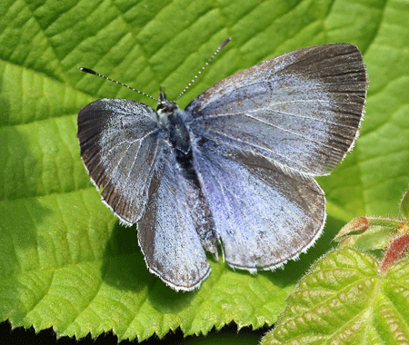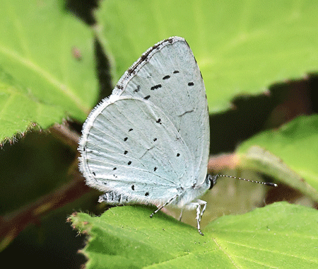 | Wing span: 26-34 mm. This butterfly is often seen in gardens, flying around shrubs. Both sexes have blue uppersides; females have black borders on both pairs of wings. In second-brood females the borders are wider. Both sexes have pale blue undersides with black dots. They usually keep their wings closed while at rest. The Holly Blue is widespread in southern and central England. It can be found in woods and along hedges where there is plenty of Holly and Ivy nearby. It can also be found in churchyards, parks and gardens. |