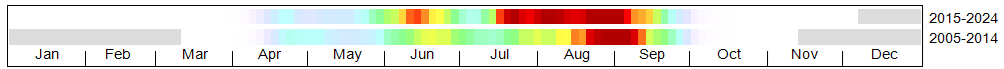 These strips provide a comparison of flight periods between the most recent survey period (upper) and the previous period (lower). The colours represent the total number of butterflies seen within three-day time intervals (smoothed for clarity). Red indicates the highest counts, and white the lowest.